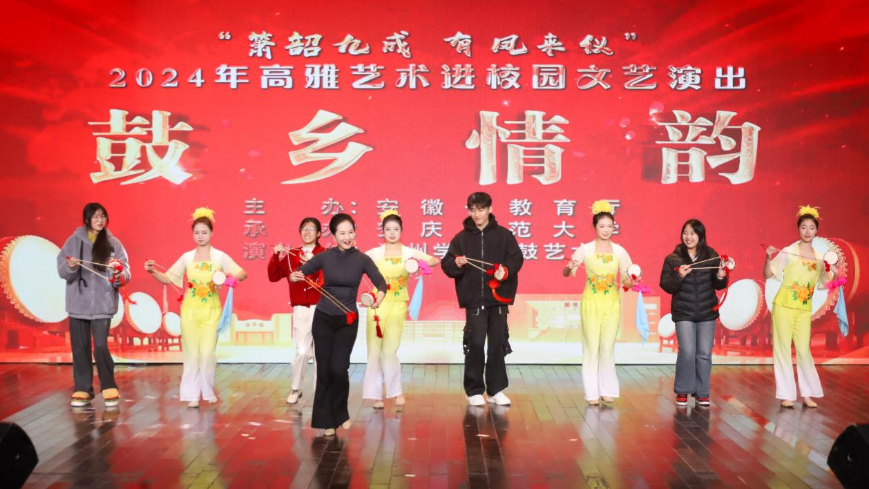 婀娜多姿的舞蹈、独具特色的花鼓、磅礴悠扬的歌声……11月28日,由安徽省教育厅主办的“萧韶九成,有凤来仪”2024年高雅艺术进校园——“鼓乡情韵”专场演出在纽约国际官网龙山校区音乐厅举行,纽约国际官网师生350余人到场观看演出。
