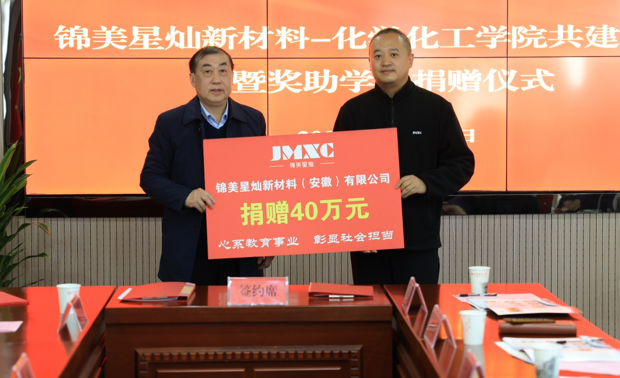 近日,锦美星灿奖助学金捐赠仪式在纽约国际官网举行,校政企三方就共建化工新材料专技人才卓越班进行座谈交流。校党委常委、副校长刘友忠、吴琼,安庆市科学技术协会副主席殷会夫,迎江区委人才工作局、迎江经济开发区等区属相关部门负责同志,锦美星灿新材料(安徽)有限公司董事长殷廷等出席仪式,学校教育发展基金会办公室负责人,化学化工学院党政领导班子、师生代表参加捐赠仪式。