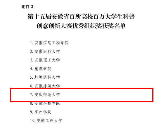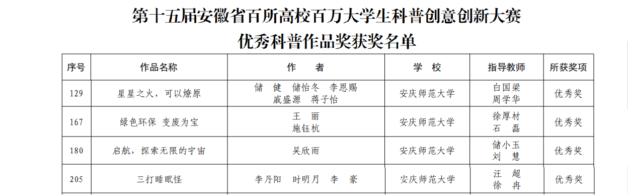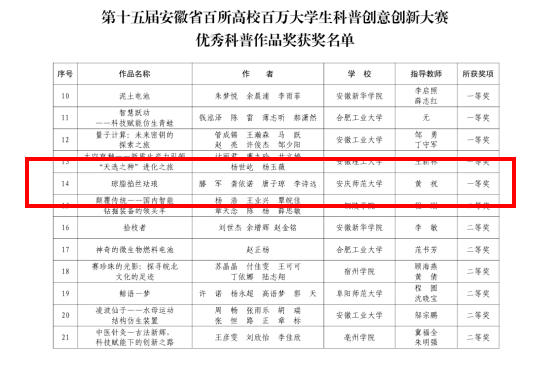 据悉,共有80所高校4810人注册报名参加本届“双百”大赛,提交参赛作品3238件。下一步,学校将认真总结大赛经验,引导广大青年学生树牢社会责任意识,弘扬科学精神,积极投身科普实践,不断增强创新创业能力,为奋力谱写中国式现代化安徽篇章作出新贡献。(撰稿:江鹏程 编辑:江伟 审核:汪洋 陈秀)