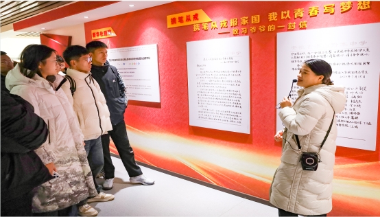 走进国防教育主题展厅,映入眼帘的便是习近平总书记给野寨中学20位考取军校学生的回信。“一切还是那么的熟悉!”化学(师范)专业2024(4)班的凌汇作为已经毕业的野寨中学毕业生,提及母校时,他依旧是满脸的自豪与骄傲。“在野寨中学的三年,我的记忆仿佛都与国防教育有关。”凌汇坦言,高考时与军校梦失之交臂,但他仍希望通过参军入伍的方式投身军营,实现自己的军人理想。