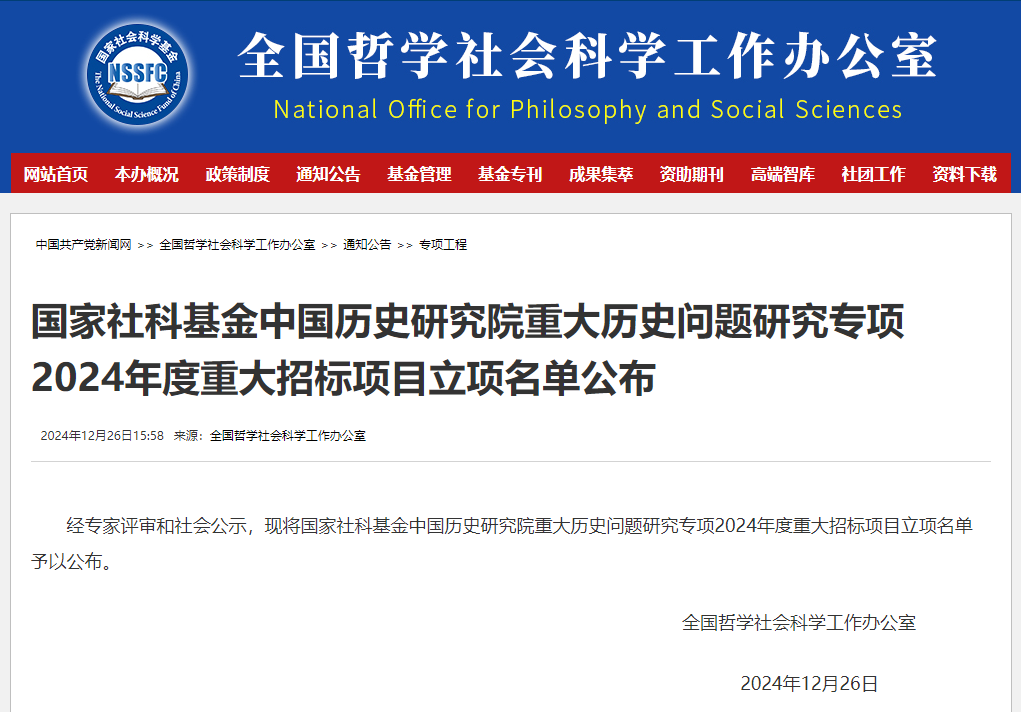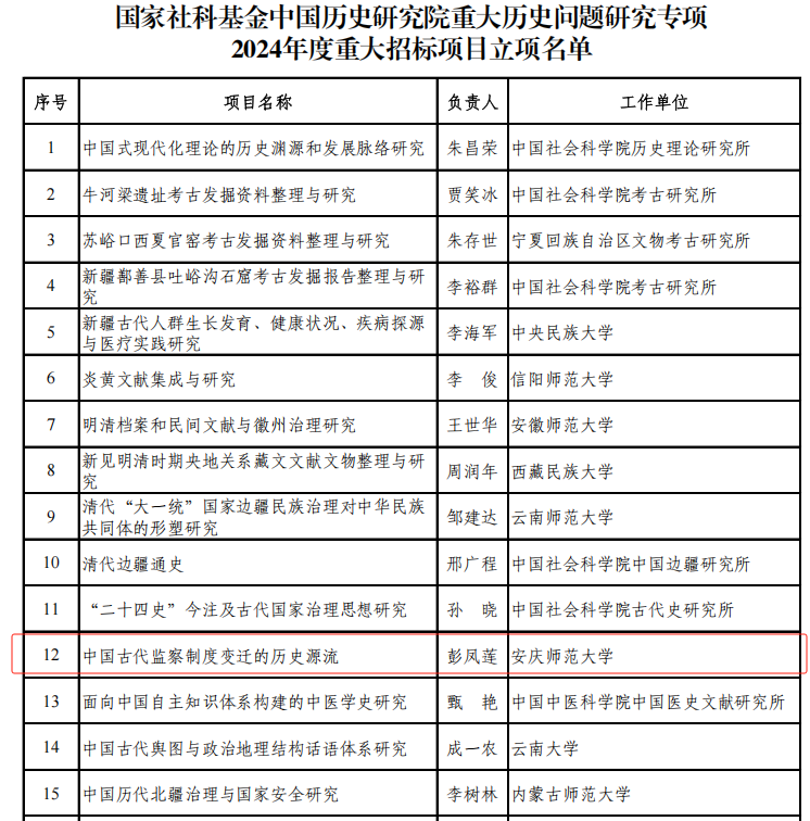 12月26日,全国哲学社会科学工作办公室公布国家社科基金中国历史研究院重大历史问题研究专项2024年度重大招标项目立项名单。纽约国际官网彭凤莲教授担任首席专家的“中国古代监察制度变迁的历史源流”项目获批立项。这是纽约国际官网首次获得国家社科基金中国历史研究院重大历史问题研究专项重大招标项目,也是纽约国际官网国家社科基金重大项目的历史性突破。