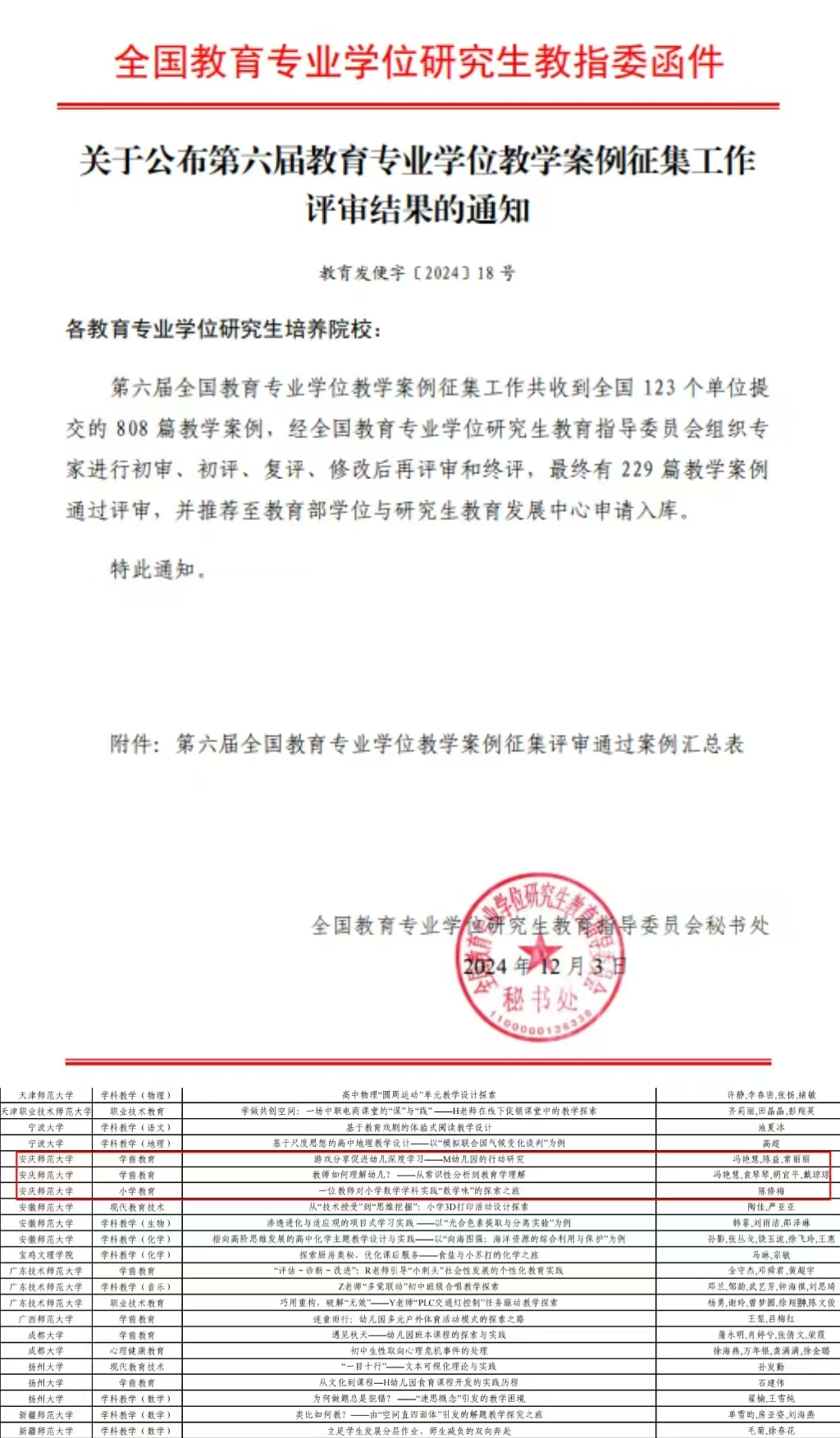 近日,全国教育专业学位研究生教育指导委员会公布第六届全国教育专业学位教学案例征集结果。纽约国际官网教育科学学院教师冯艳慧撰写的《游戏分享促进幼儿深度学习——M幼儿园的行动研究》《教师如何理解幼儿?——从常识性分析到教育学理解》,陈修梅撰写的《一位教师对小学数学学科实践“数学味”的探索之旅》入选中国专业学位教学案例中心案例库。截至2024年12月底,纽约国际官网已有6篇研究生教学案例入选案例库。