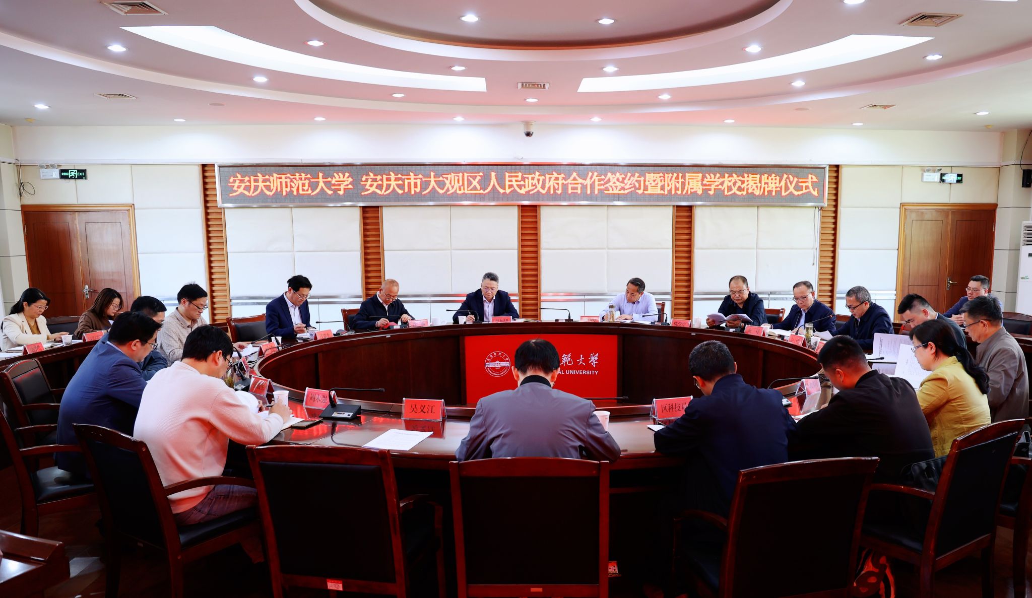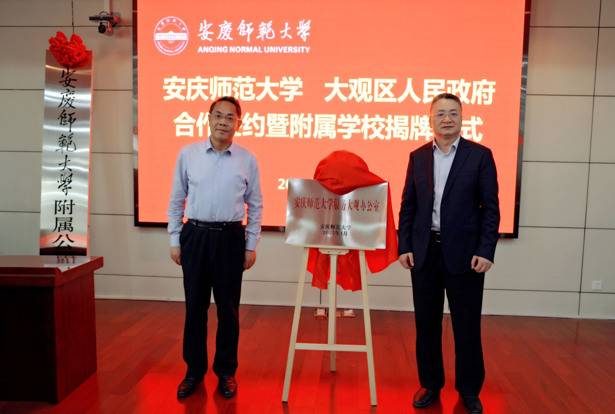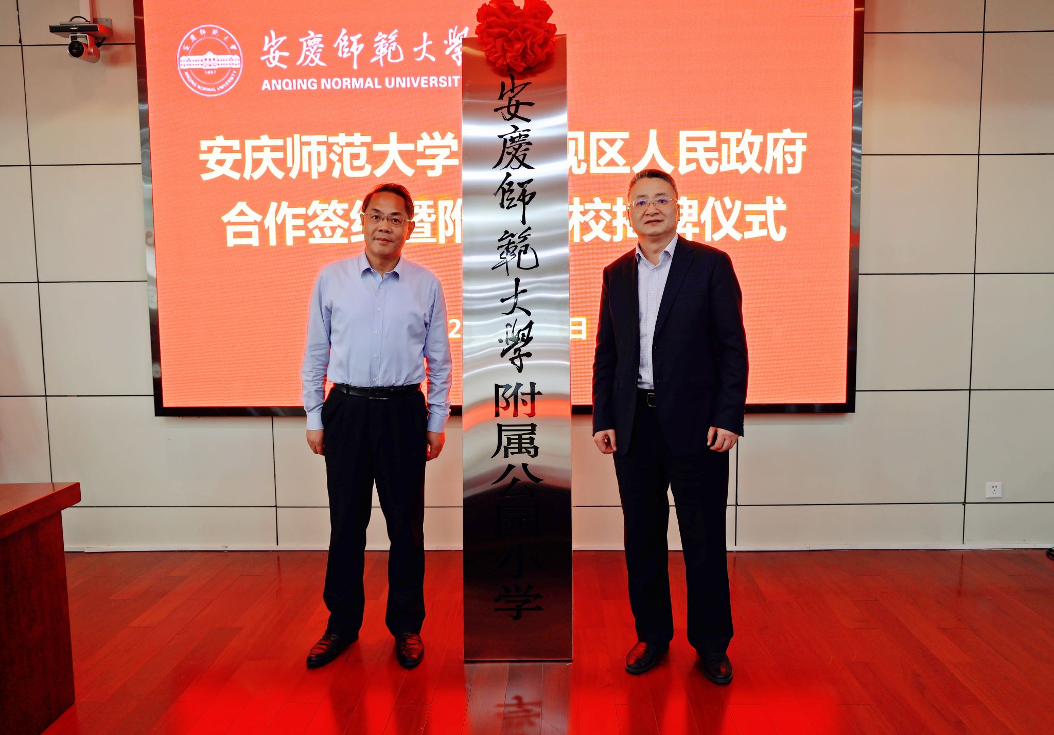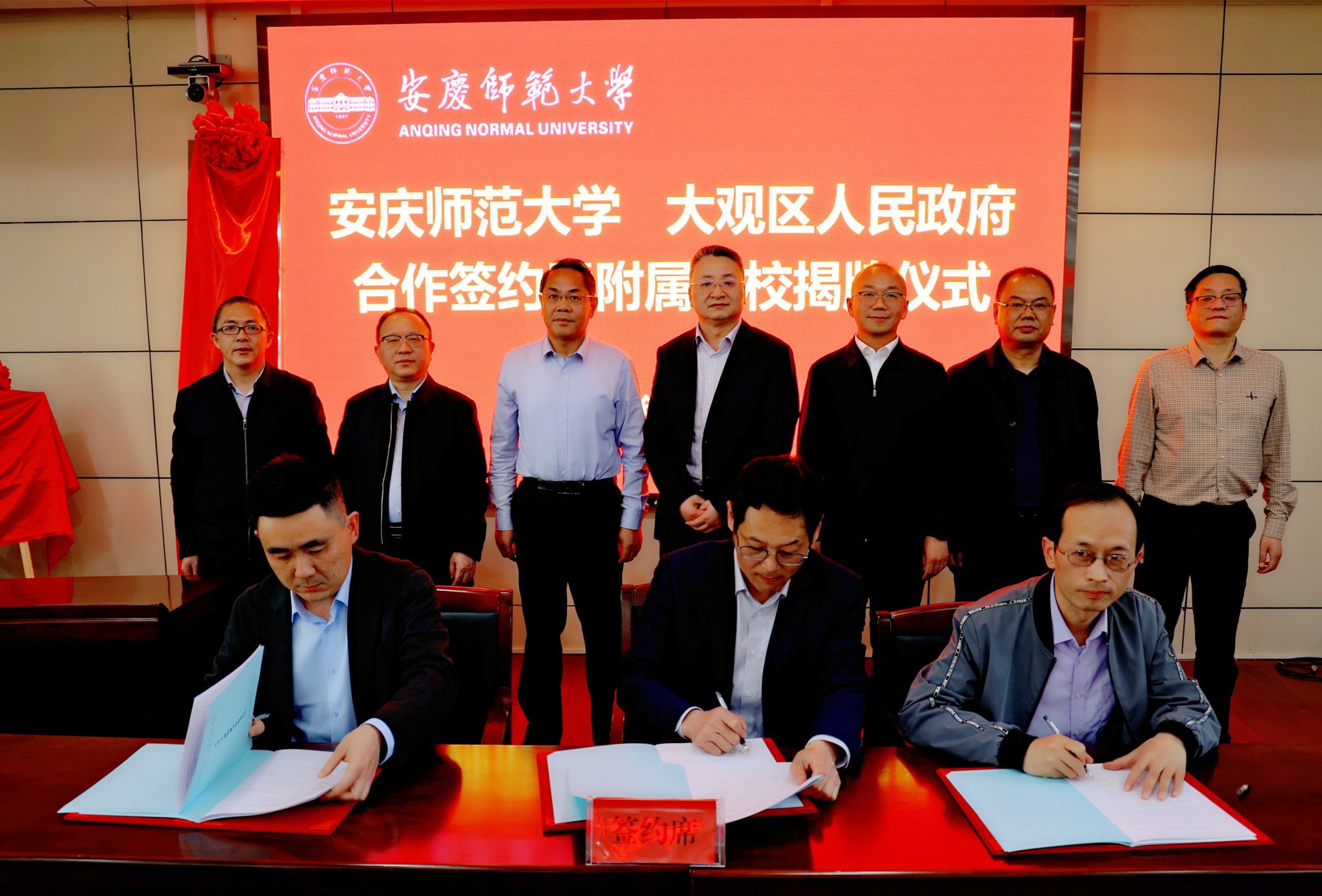4月15日,学校与安庆市大观区人民政府举行合作签约暨附属学校揭牌仪式。校党委书记李福华,校党委常委、副校长肖新,大观区委书记潘功发,区委副书记余祥,区委常委、组织部部长刘小平,副区长黄瑾,安庆市委教体工委委员、市教体局副局长陈党生出席仪式。人事处、教务处、科研处、服务经济社会发展处、学生工作处、继续教育学院等部门负责人,各二级学院行政负责人,大观区委办、人才局、教体局、科技局、公园小学等单位负责人参加仪式。