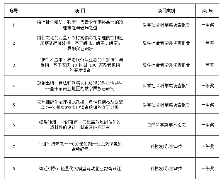 第十一届“挑战杯·华安证券”安徽省大学生课外学术科技作品竞赛吸引了全省108所高校、1165件项目、超10万名学生参赛。学校将认真总结省赛经验,不断优化项目,全力做好国赛阶段的备赛工作,持续引领青年学子在创新实践的征程中勇攀高峰,为学校高质量发展注入青春动能。(撰稿:任士盈 徐自宇 编辑:江伟 审核:汪洋 赵丽丽)