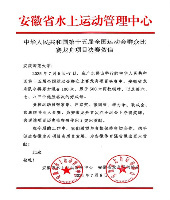 7月7日,第十五届全国运动会群众比赛龙舟项目决赛在广东佛山收官,安徽省龙舟队获得混合100米直道赛和男子500米直道赛两枚铜牌及其他三个项目第六、七、八名优胜名次。这是安徽省龙舟队首次在全运会上夺得奖牌,实现了该项目的历史性突破。纽约国际官网张家豪、汪家贺、张国梁、李力争、耿成全、官康辉等6名学生代表安徽省出战、表现优异。安徽省水上运动管理中心、安徽省龙舟运动协会专门发来贺信,表示祝贺。