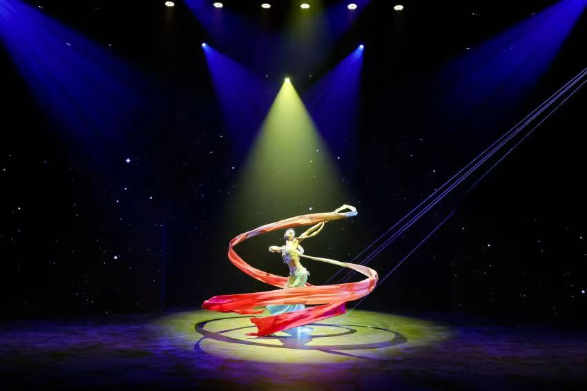 《飞天》作为诗乐盛典中唯一的女子独舞,音乐学院教师童昕用24米长绸的萦绕翻卷,成功地塑造了“霓裳曳广带,漂浮升天行”的敦煌飞天形象。