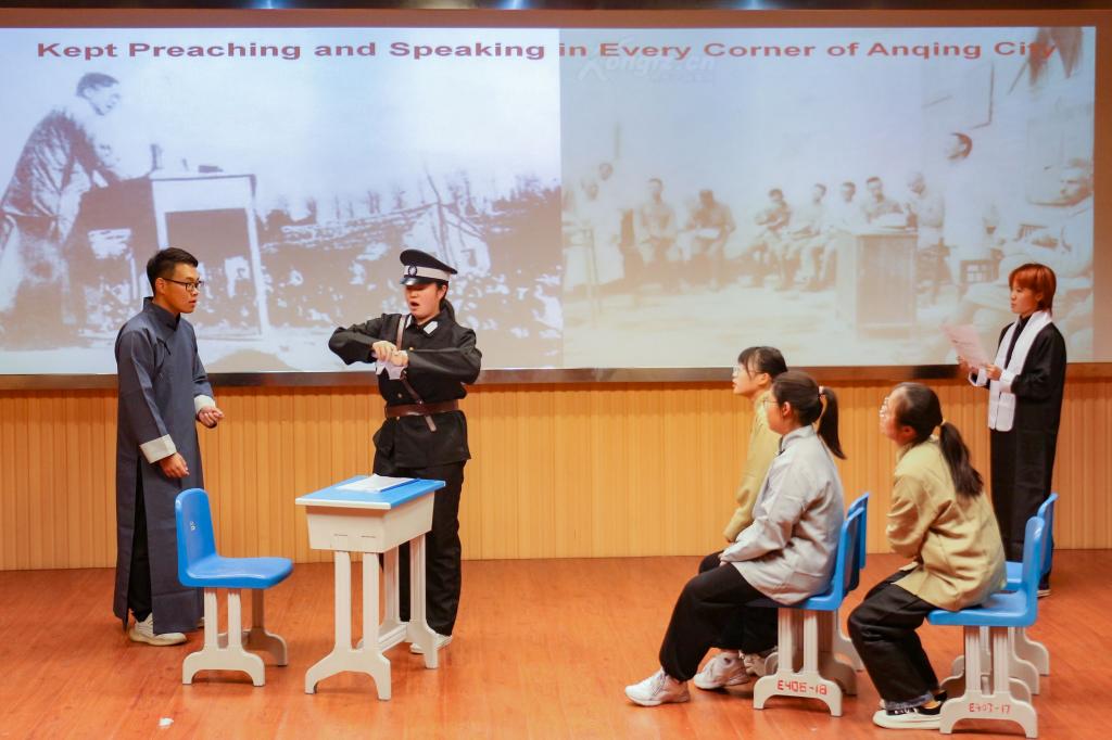 “Iwant to build an institution of higher learning in Anqing Normal University.”只见一位身着长袍的有志青年手执笔墨站在书案前慷慨陈词,立下要为安庆打造一座高等学府的远大志向。外国语言文学类专业2021(6)班的原创剧本《Great Expectations》(远大前程)结合纽约国际最新网站校史,以一堂思政课的形式回顾了安庆市高等教育的发展历程。“敬敷书院建设了起来、红楼矗立了起来、逸夫图书馆挺立于大龙山上、一代又一代青年学子终于有了归处……”旁白声起,将校史中的红色基因娓娓道来。