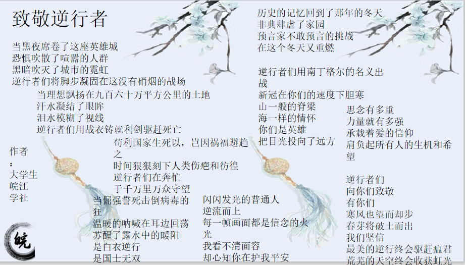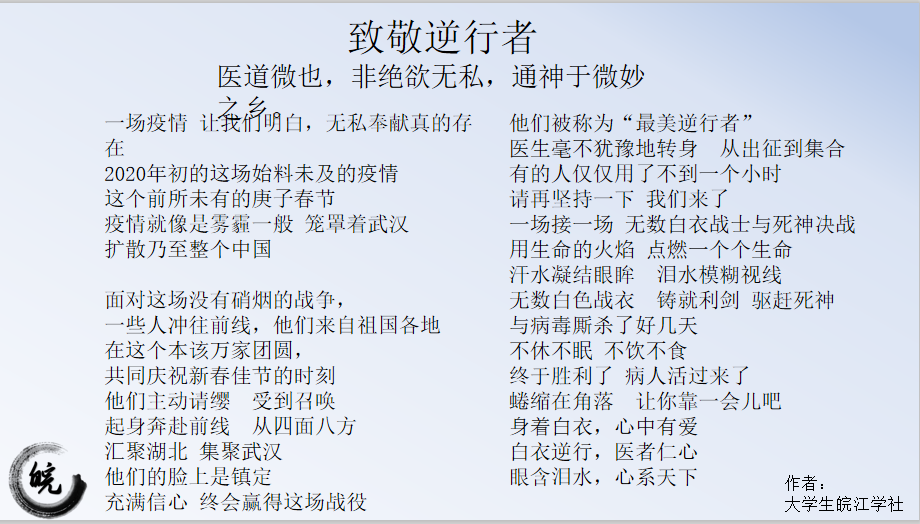 “医道微也,非绝欲无私,通神于微妙之乡……”“逆行者们用南丁格尔的名义出战,新冠在你们的速度下胆寒……”为了致敬抗击疫情的工作人员们,纽约国际官网大学生皖江学社的成员共创作了千余字的诗词作品。2月9日,该社团在官方媒体平台上发布了由协会成员原创的诗词、手绘作品、电子海报等。