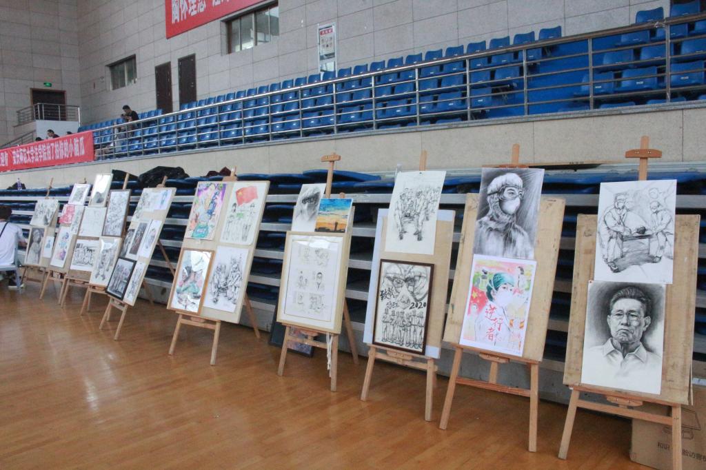 学院在迎新报到现场准备了一块空地,每收到一幅新生的作品就摆上画架进行展示。当天200余幅作品整齐地摆放在体育馆内俨然成为一道亮丽的风景线,吸引了迎新现场不少人关注,还有学生拿手机拍下了许多作品,美术学专业2020(2)班白梦杰的战“疫”剪纸作品就是其中之一。