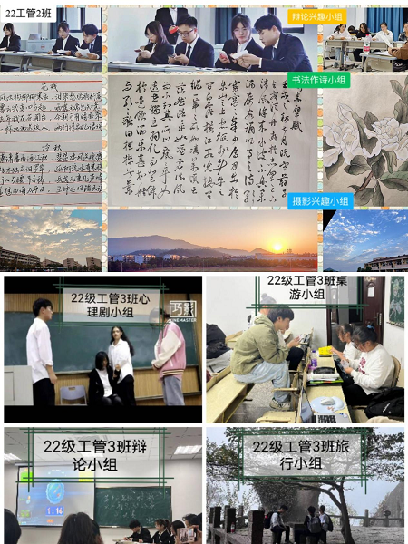 通过一系列的精心筹划与科学准备,部分新生班级的学习小组、书法诗作小组、摄影小组......正有条不紊地展开。其中各班构建以学习小组为纽带的“自主学习—小组学习—班集体学习”的互助学习模式,进一步推动班风、学风建设。