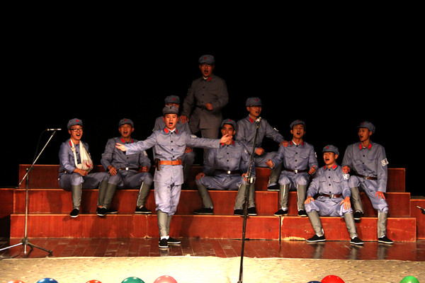尽管是传统的汇报演出,却有不少同学别出心裁,让大家眼前一亮。14级音乐学2班的男生小合唱《弹起我心爱的土琵琶》就是其中之一。不同于其他班级男生合唱时中规中矩的西服,2班的10个男生则穿上了八路军的军装,其中一位同学的手还被绑上了绷带。清一色的军人模样站在舞台上,赢得了场下观众热烈的欢呼。表演者杨郡安说:“我们报名了合唱,就想着要唱首红歌。歌曲、服装、动作都是我们设计、商讨的,为了更好地展现我们的学习成果,也为了向革命前辈们致敬。”