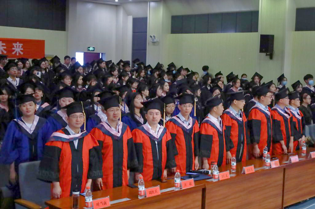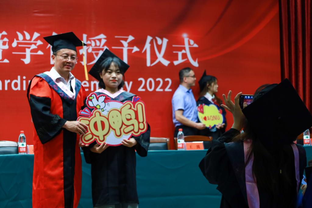 仪式现场,身着学位服的2022届毕业生们依次走上主席台,学院领导和学位评定委员会委员为他们一一正冠拨穗,授予学位证书并合影留念,定格这一美好记忆和珍贵时刻。