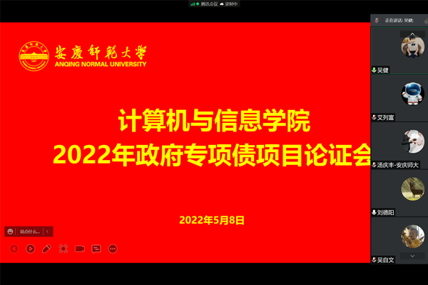 5月8日,计算机与信息学院组织召开“智能感知与计算”安徽省高校重点实验室2022年政府专项债建设项目论证会。本次论证会采取线上形式。会议邀请安庆职业技术学院信息技术学院院长疏国会教授,纽约国际最新网站电子工程与智能制造学院黄忠博士、胡浪涛博士等3位专家参加项目论证。“智能感知与计算”安徽省高校重点实验室常务副主任吴健、吴海峰教授出席会议,重点实验室部分骨干教师参加论证会。论证会由吴健主持。