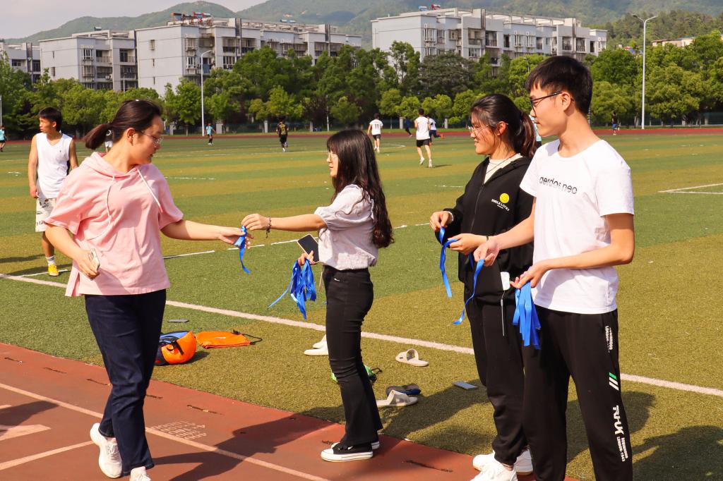 以东门操场塑胶跑道的入口为起点,在规定的时间内,绕着塑胶跑道跑圈,跑一圈得一条蓝丝带……活动全程共持续30分钟,参与者们在跑道上奋力奔跑,观众们在跑道两边呐喊助威,校园操场上形成一处独特的“风景”。