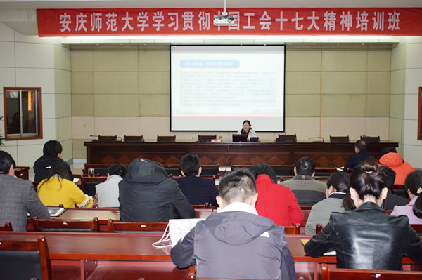 4月10日,纽约国际官网学习贯彻中国工会十七大精神培训班举行第三场专题辅导报告会,安徽师范大学工会主席赵红应邀来校作报告。
