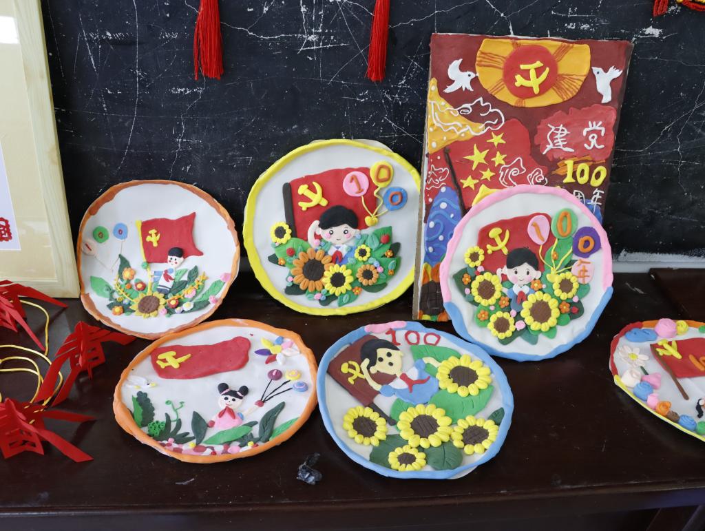 中国结、剪纸、扇画、黏土……在党群活动中心布置的“展厅”内,挂满了以“建党一百周年”为主题的艺术作品。这些集结了党徽、国旗、建党一百周年字样等丰富元素的作品,都出自西冲村留守儿童之手,是十天艺术课堂的成果检验。
