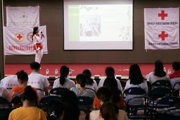 讲座邀请了安庆市无偿献血者协会副会长兼安庆市红十字造血干细胞捐献志愿服务队队长王莘、安庆市无偿献血者协会副会长濮建明、无偿献血者倪申超向同学们普及献血知识,近140名学生到场聆听。