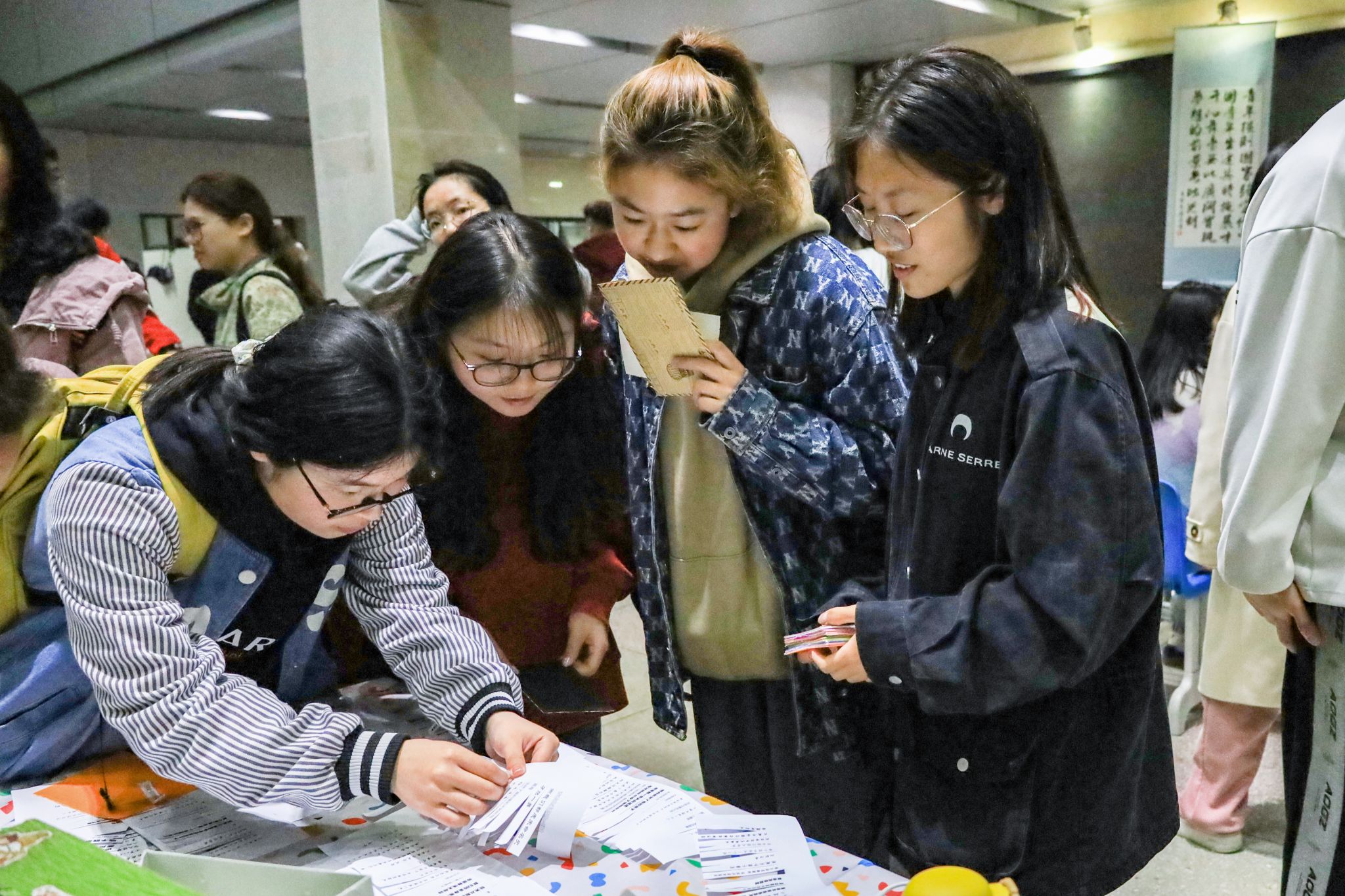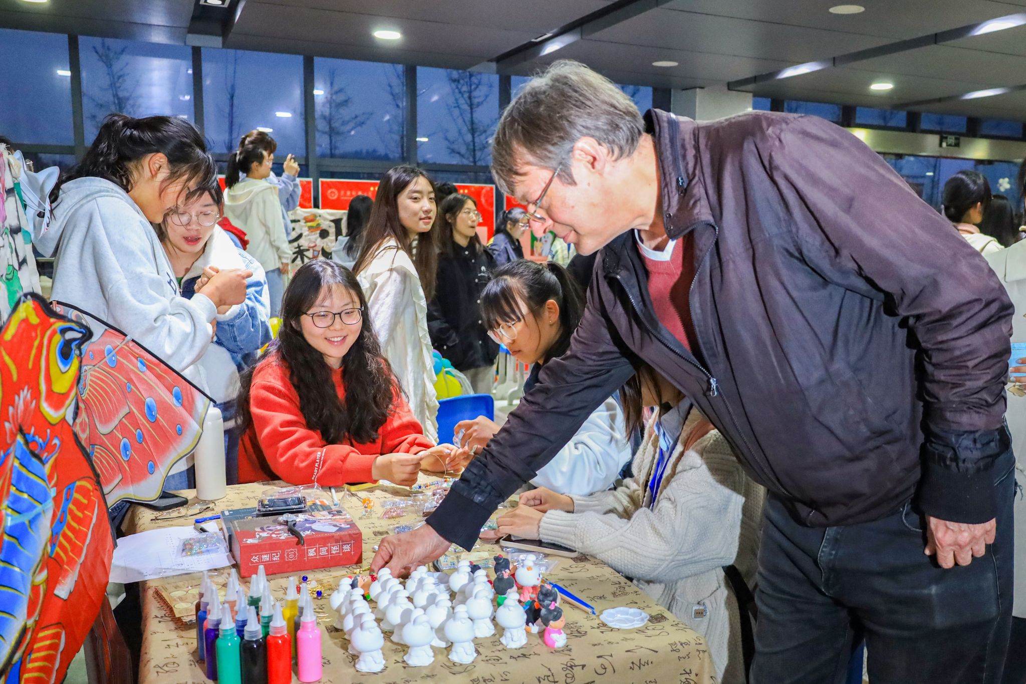 古典含蓄的书法扇面、形态可爱的石膏娃娃、精致美观的纸鸢……外国语学院的汉风古韵铺和美术学院的艺见倾心展合力打造“艺术天堂”,引得不少学生停足驻留。外国语言文学类专业2022(3)班的丁明雅现场制作古风手链,直言“过了把古风瘾”。