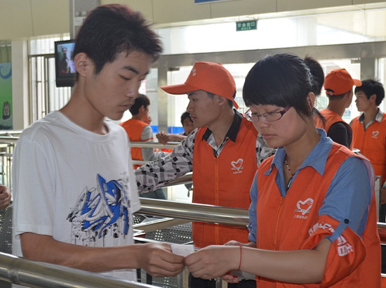 在为期三天的志愿服务活动中,同学们身着统一服装,各尽其职,帮助旅客提行李,维持售票大厅买票秩序,协助检票员检票。此次活动吸引了安庆广播电视台记者的关注,体育学院体育教育专业2011级6班的张雅丽同学接受了记者的采访,并表示“尽自己小小的力量,为社会贡献小小的服务。”5月1日上午,体育学院专职辅导员贾涛老师也前往火车站并亲切看望了参加志愿服务的同学。贾老师表示,此次志愿服务活动对学生不仅是一次有意义的社会实践活动,同时也是学生资助工作的有益补充,帮助学生树立自立自强精神,在帮助他人的同时实现自己的人生价值。