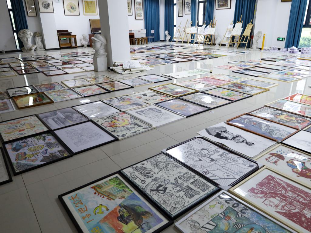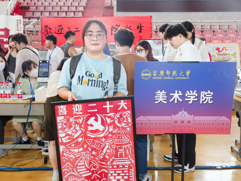 红色剪纸勾勒出蜿蜒壮阔的长城、蓄势待发的火箭、彩色油画棒渲染出形似蛟龙的高铁、筑梦苍穹的宇航员……9月9日,以“喜迎二十大,奋进新征程”为创作主题的270余件作品在体育馆与美术学院教学楼展出,吸引了众多师生驻足观看,成为学校迎新现场一道靓丽的风景线。