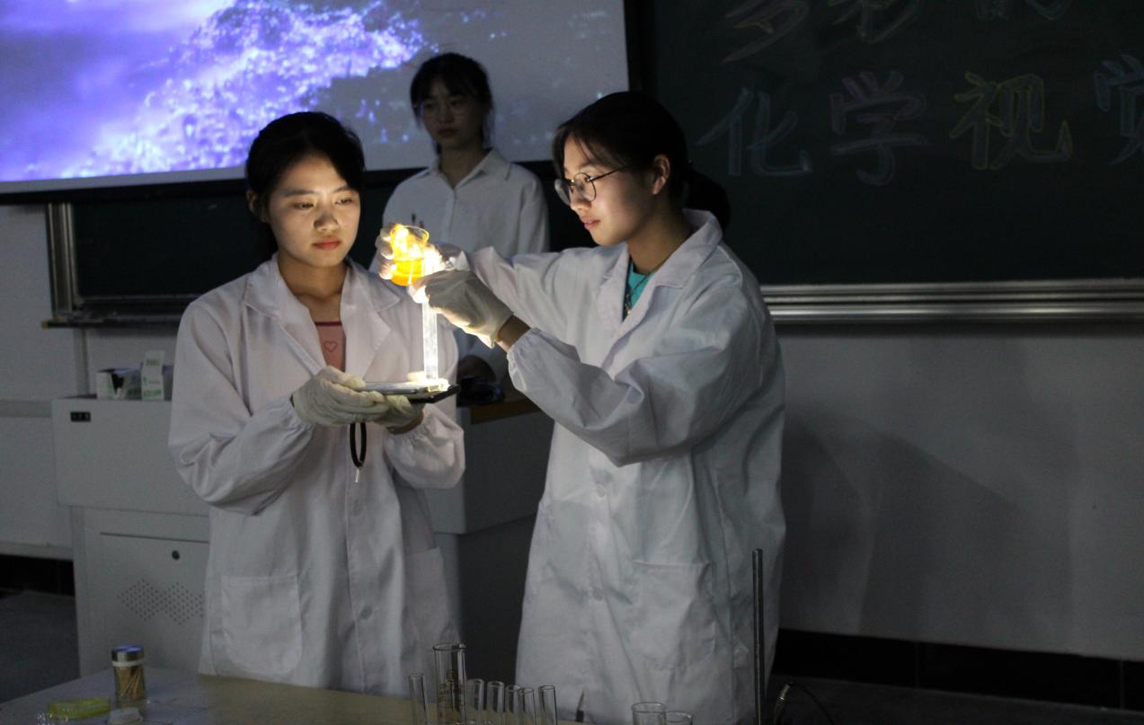 “美丽的彩虹溶液”“神奇的大象牙膏”“会变脸的晴雨花”“变幻莫测的海洋之心”“惊心刺激的掌中火焰”等实验,给现场同学带来了一次难忘的视觉色彩冲击。主讲人与观众积极互动,营造了热烈浓厚的课堂氛围。项目团队积极发挥专业优势,轻松有趣地讲解实验原理和过程,不仅让同学们观看到趣味化学实验现象,还让同学们明白了奇妙化学现象蕴含的原理。“抓住一闪而过的灵感,通过实验最终实现,这让我觉得很自豪”,2021级化学(4)班的学生高婉晴说。