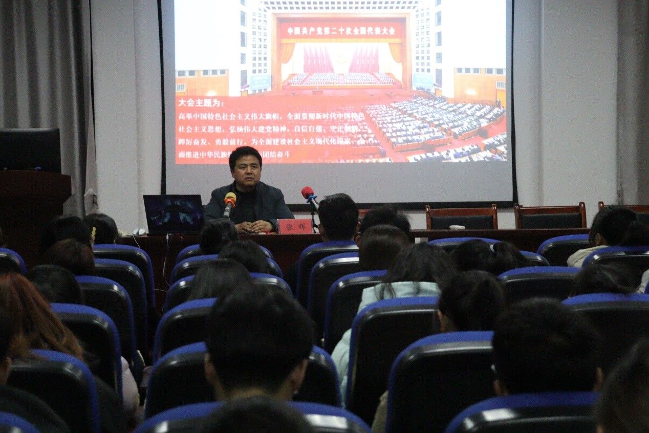 张辉向同学们深入分析了学习领会党的二十大精神的重大意义,介绍了党的二十大报告的主要内容,并结合大学生的学习生活实际和学院专业特色带领同学们深入学习领会党的二十大精神实质。他同时结合党的二十大报告内容分析了党关于青年和青年工作的重要精神。他要求,同学们要全面深入学习贯彻党的二十大精神,牢记总书记在二十大报告中对广大青年提出的期望,要坚定不移听党话、跟党走,怀抱梦想又脚踏实地,敢想敢为又善作善成,立志做有理想、敢担当、能吃苦、肯奋斗的新时代好青年,让青春在全面建设社会主义现代化国家的火热实践中绽放绚丽之花。