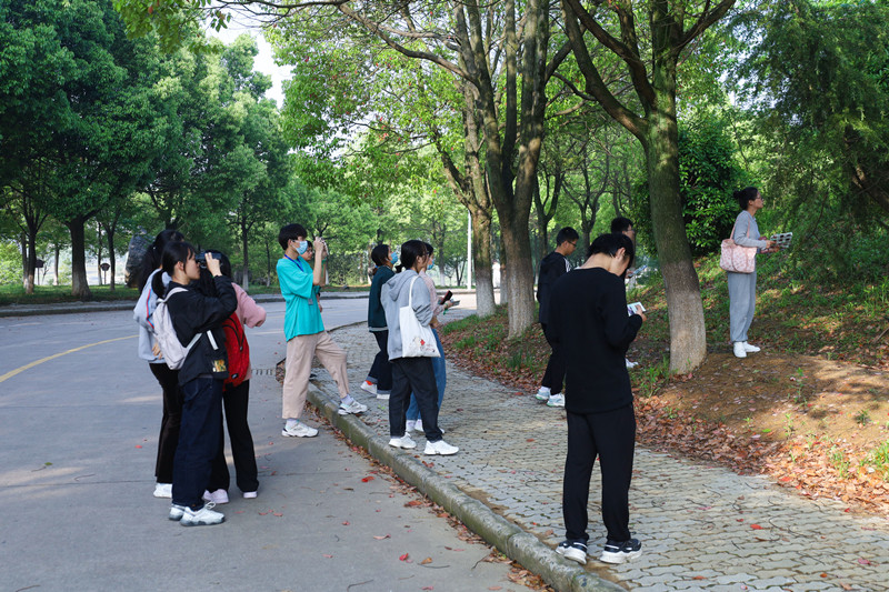 沿双龙湖出发,走进宿舍楼和别墅区这边的树林,遇见的鸟儿或潜游水中,或跳跃枝头。不少学生纷纷感叹:“学校简直是‘鸟的天堂’!”大家一边观看,一边“争分夺秒”地按下快门。“你这只‘肉丸子’真是一点儿也不认生呢,看见我也不‘逃’。”外国语言文学类专业2021(2)班许劭扬正在“对话”草坪上“闲庭信步”的山斑鸠,眼里的宠爱满得快要“溢”出来。“之前从来没有这么近距离地观察过他们,原来生活中有这么多的乐趣。”他表示,今天的观鸟行动让自己从机械式的生活中“跳脱”了出来。