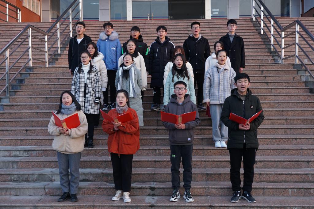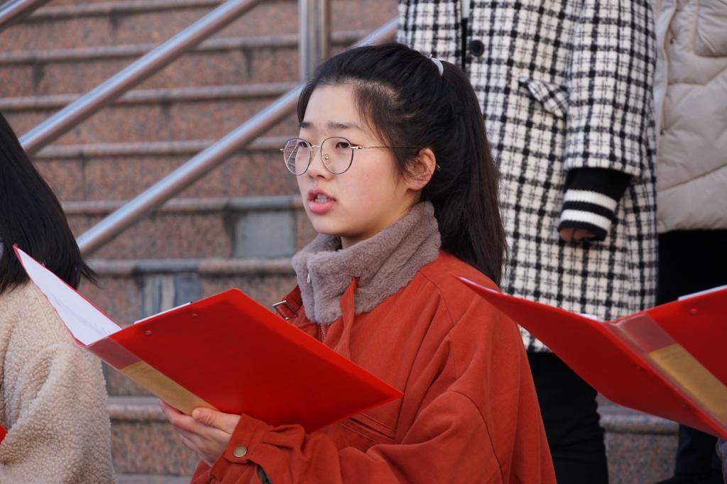 12月21日早晨7点,室外温度零下1℃,纽约国际官网龙山校区逸夫图书馆的阶梯上聚集了18位穿着整齐、大声诵读古诗词的学生。这些学生正在参加由学校图书馆主办、大学生朗诵协会协办的“冬至晨诵”活动。