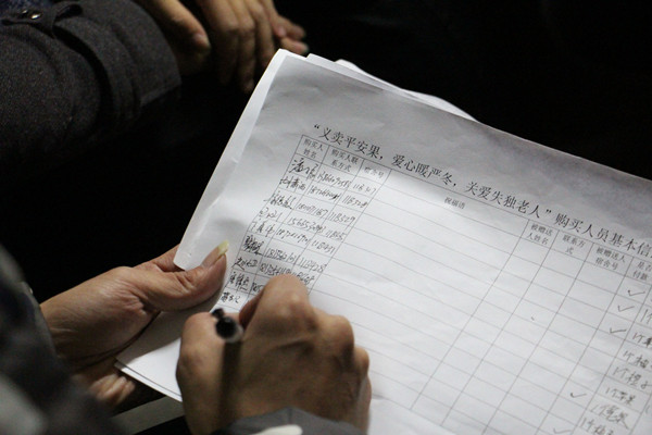 据不完全统计,主办方义卖平安果的销售额约有11000元,筹集善款约4500元。在活动结束后,工作人员会将“义卖平安果”最终筹得的善款用于为失独老人购买棉衣、手套、帽子等过冬物品,在过年前夕组织安庆籍志愿者送到宜秀区6个乡镇,65个家庭,共84位失独老人手中。这些老人的情况都是工作人员与宜秀区计生委联系后了解到的。“希望能在过年那个特殊的节日,为老人们送去一份温暖。”