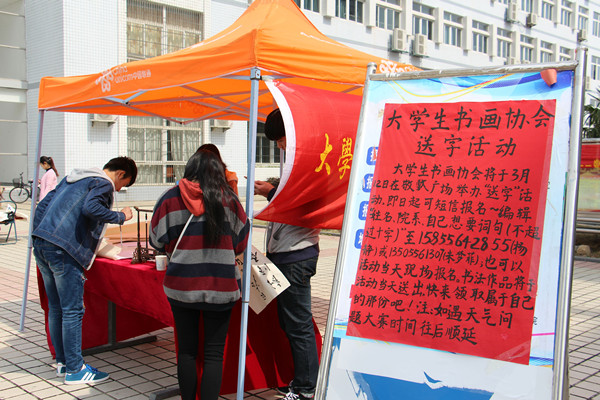 “我们今天一共送出去100多幅书法作品,均是由协会的成员们书写而成。”大学生书画协会的会长杜良伟是此次活动的负责人和策划者,谈及举办活动的初衷,杜良伟说:“写字能让人沉淀下来,抛却浮华,心无旁骛。书法送字活动,让同学们能够参与专业的现场书法创作过程,领略国粹的魅力,是一种很好的文化宣传方式。”(文/学生记者 孙燕婉 图/学生记者 程汗)