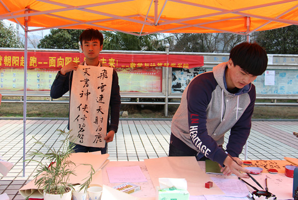 “路漫漫其修远兮,吾将上下而求索”,“天行健,君子以自强不息”,“福如东海,寿比南山”,“待到山花烂漫时,与我相见可好”……同学们要求写的文字中,有对自己的勉励,对别人的祝福,也有彼此之间的约定。大家紧紧围绕着写书法的同学,饶有兴致地观看着书写过程。一幅作品完成,场边顿时传来欢呼声。15电信的秦晨晨要求写的字是“宁静致远,心无旁骛”。“书法是一种国粹,也是一种修养,能让自己的心平静。这句话是我送给自己的勉励,准备回去就贴在寝室的墙上。”秦晨晨拿到送给自己的作品后一脸满足,连声感谢。
