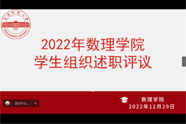 12月29日,数理学院线上组织召开2022年度学生组织述职评议会议。学院党委副书记彭芳珍、团委负责人、团委兼职副书记、各学生社团负责人、团学骨干共20余人参加会议。