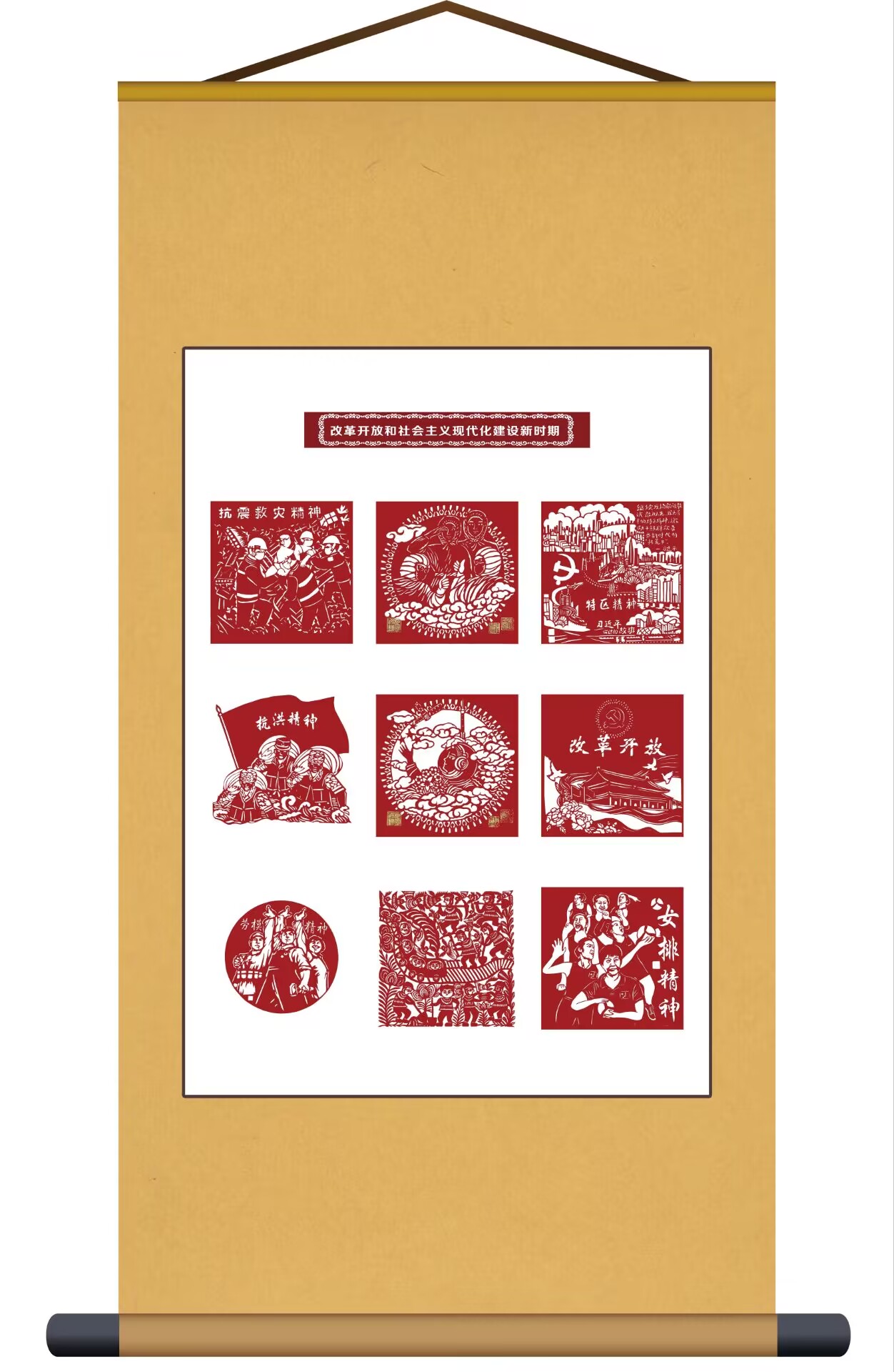 作品以时间为主线,聚焦中国共产党百年历程中的重要人物、事件,展示了新民主主义革命时期、社会主义革命和建设时期、改革开放和社会主义现代化建设新时期、中国特色社会主义新时代4个时期,首批被纳入中国共产党人的精神谱系的46种伟大精神。作品统一采用传统红色剪纸,通过线条刻画等方式,将党的光辉历程和历久弥新的精神谱系形象化、艺术化。