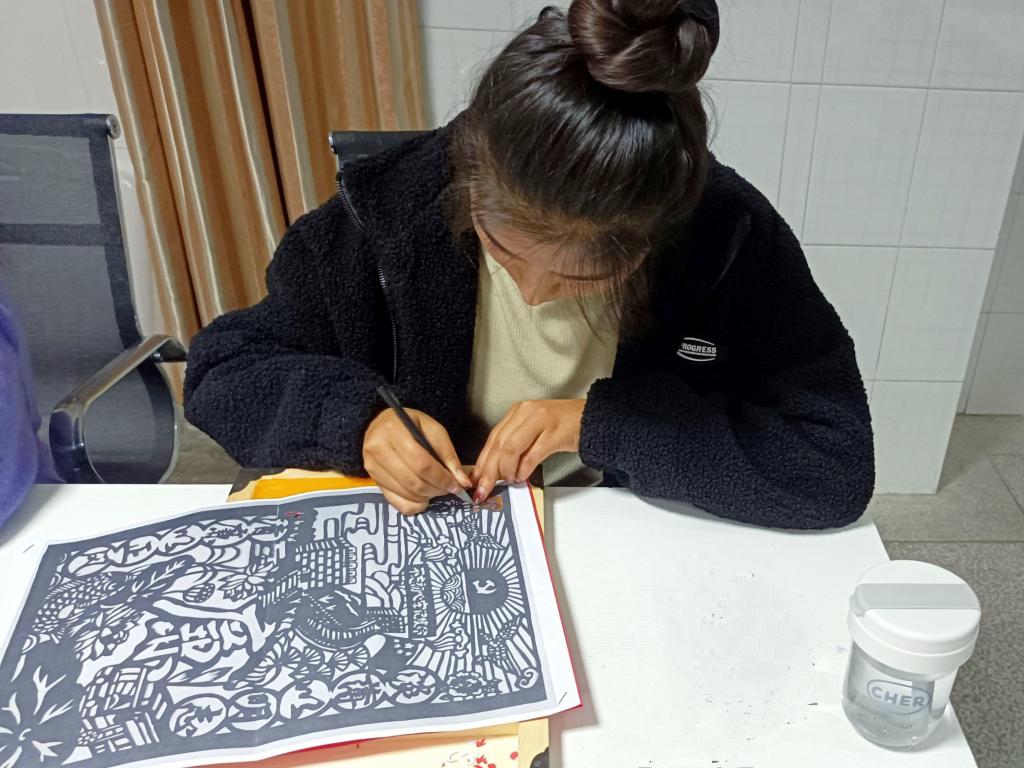 “时代虽在变迁,但精神依旧永恒,将非遗剪纸与中国精神相结合,我觉得很有意义。”计算机与科学技术专业2021(1)班的周意参与了“红旗渠精神”作品的雕刻,“雕刻前,我在网上查找了很多关于红旗渠的故事,勤劳勇敢的30万林州人民,苦战10个春秋,仅靠着一锤、一铲、两只手,在太行山悬崖峭壁上修成了全长1500公里的红旗渠。他们的奋斗故事,也让我更加深刻地理解了‘自力更生、艰苦创业、团结协作、无私奉献’的红旗渠精神。”