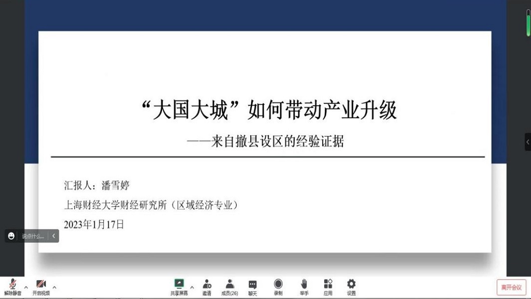 1月17日,由经济与管理学院打造的研究生学术交流平台“优博讲坛”第4期活动如期开讲,来自上海财经大学财经研究所的潘雪婷博士在线分享了题为《“大国大城”如何带动产业升级——来自撤县设区的经验证据》的学术报告,学院统计学专业研究生及部分教师参加了交流活动。讲坛由经济与管理学院副院长徐俊杰主持。