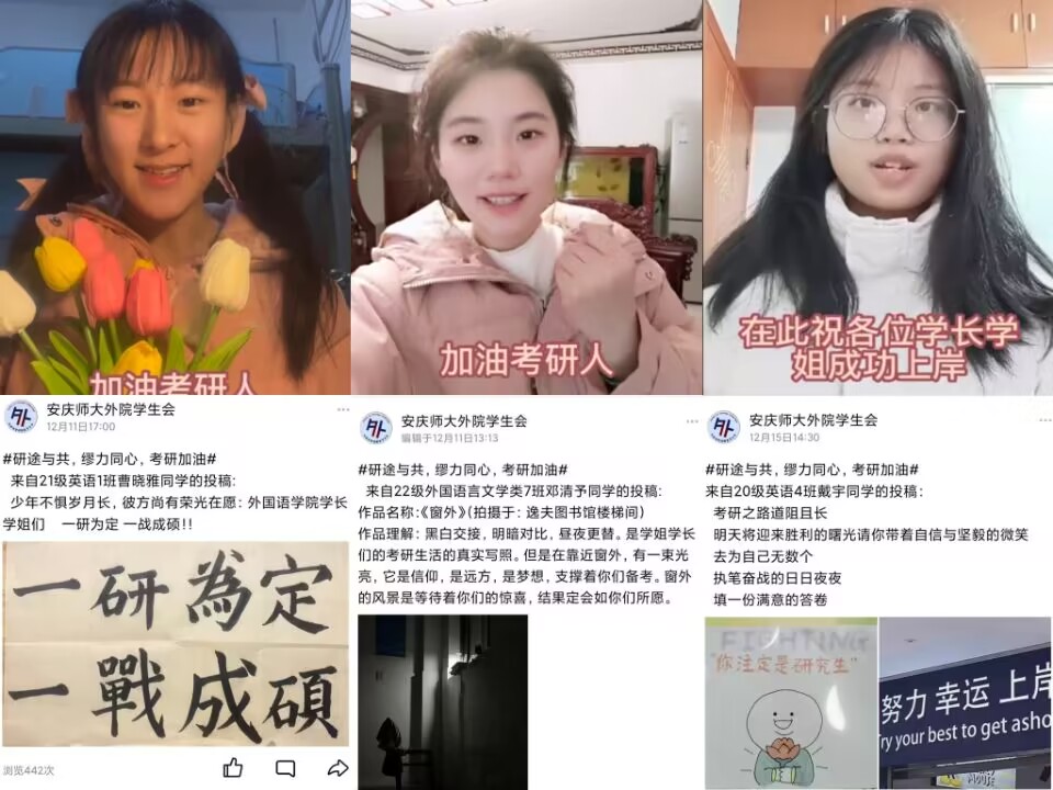 “君不见长松卧壑困风霜,时来屹立扶明堂。”“山水总相逢,来日皆可期。”“关关难过关关过,前路漫漫亦灿灿。”……从12月初起,通过外国语学院的新媒体平台,100余位教师和学生向考研学子表达祝福。或是以原创语段,或是以摄影图片,或是以经典文段,更有老师请来家中“萌宝”拍摄视频一同为学生“摇旗呐喊”“加油鼓劲”!