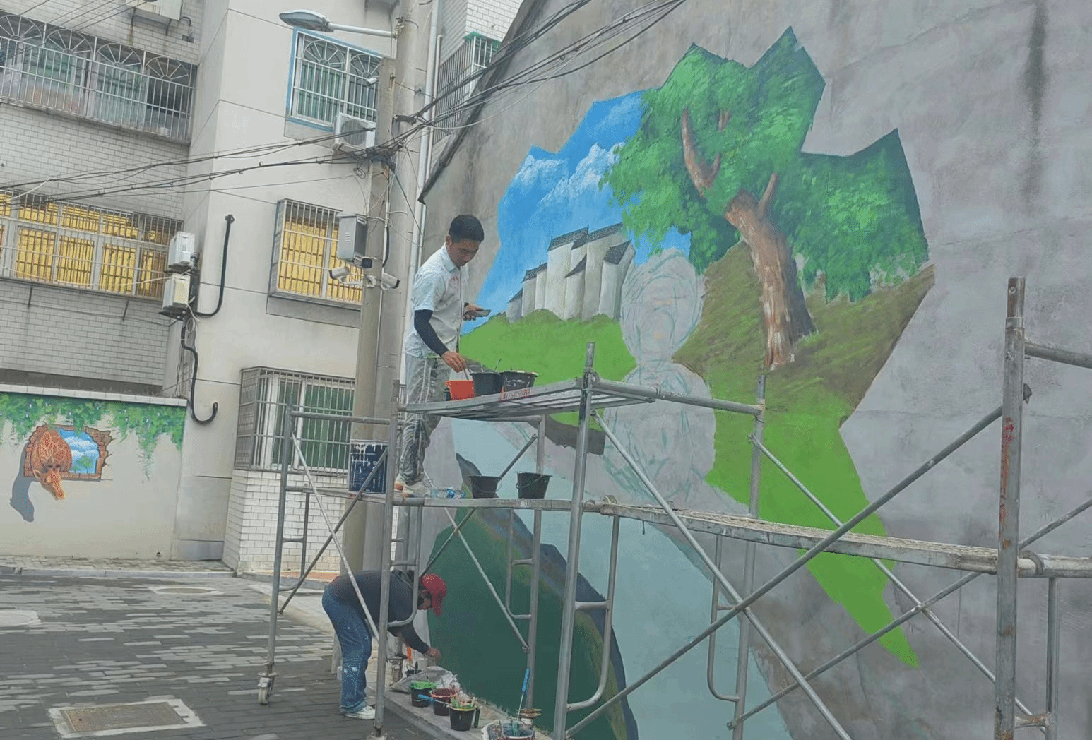 近日,桐城市文昌街道建设社区中一幅幅巨型墙绘作品“火”出圈,不少居民游客纷纷前来打卡拍照。这些作品皆出自美术学院“绘美桐城”暑期“三下乡”社会实践团,团队成员以“老区街景”“六尺巷文化”“网红打卡”为主题,结合当地历史文化与社情民意,以旧墙为画布,绘制出近1000平方米的艺术墙。