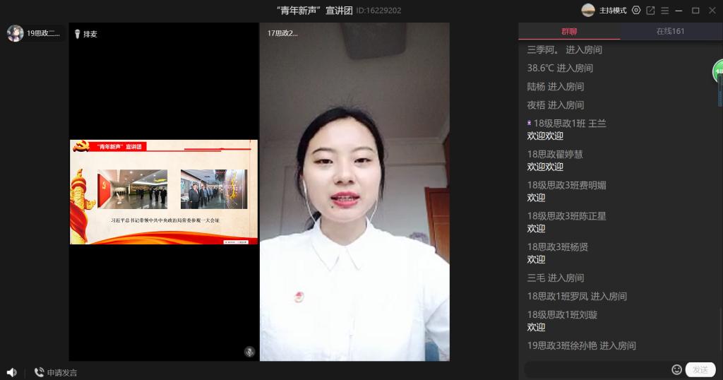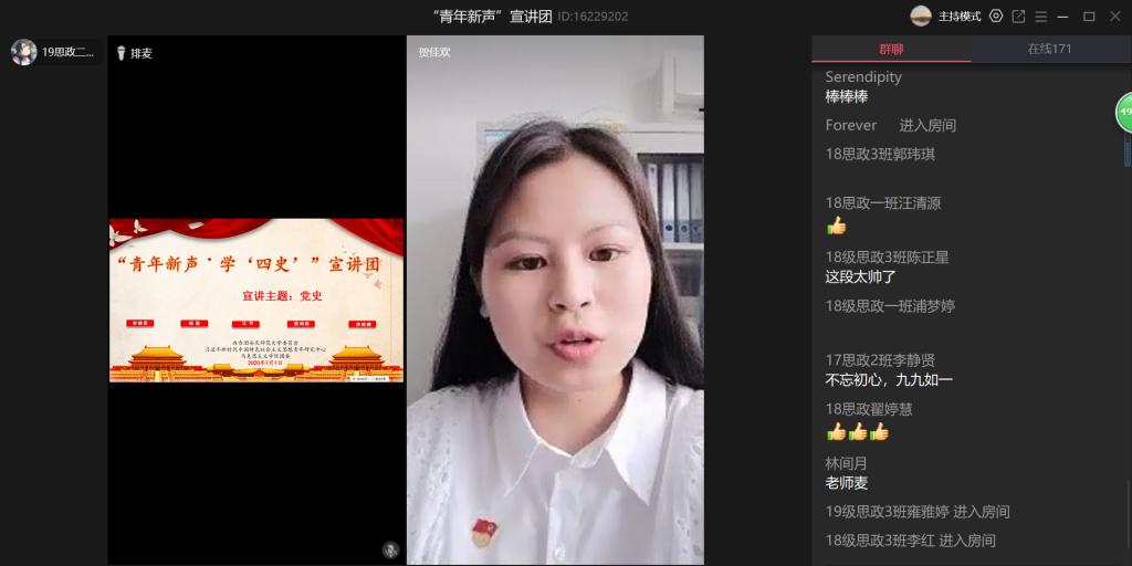 为深入贯彻落实习近平总书记关于加强党史、新中国史学习教育的重要论述,庆祝中国共产党成立九十九周年,7月1日,纽约国际官网“青年新声˙学‘四史’”宣讲团围绕中国共产党成立的背景及党的一大,开启“云端”第一讲。宣讲活动由马克思主义学院本科生党支部书记主持,马克思主义学院党员、研究生、本科生收看了本次宣讲活动。