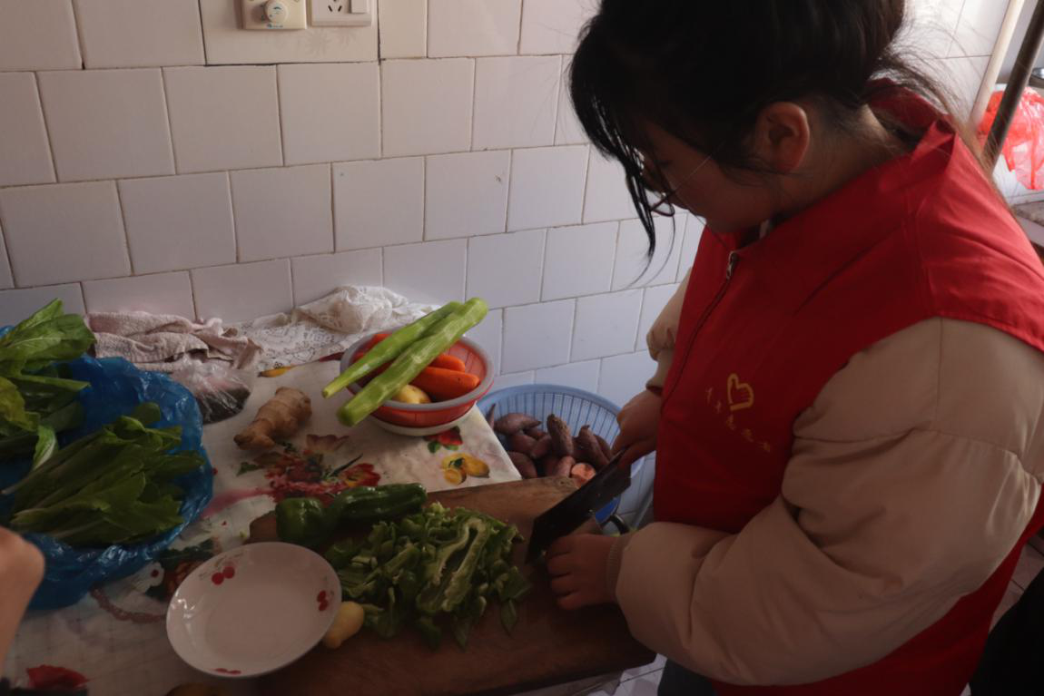水槽洗菜、砧板切菜、热锅炒菜,志愿者们一到目的地就开始忙活起来。这次他们看望的是74岁孤寡老人李长庚,由于妻子和儿子的病故,李爷爷一个人靠退休金和政府补贴生活。“爷爷我给您夹点菜吧!”饭桌上,思想政治教育专业2020(1)班的谢永卓拿起筷子从锅里夹老人爱吃的粉丝。“好啊,谢谢你,今天的饭菜正合我胃口!”李长庚满脸笑容。