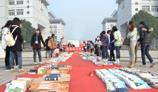 11月22日,在龙山校区教学楼广场,由龙睛读书社组织的“书香满校园”活动,给广大师生提供了一个不用去图书馆就可以借阅图书的机会。活动由龙睛读书社主办,白鲸文学社、敬敷文学创造社、大学生书画协会协办,包括诵读经典、晒书籍、心愿交流与分享、卡题竞猜等几项内容。