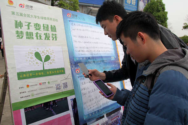 上午9点,“绿植领养”活动开始。活动现场的桌子上摆满了装有佛甲草、含羞草、向日葵、马兰花、波斯菊五种植物的种子或幼苗的盆栽,展板上印的同学们的宣誓手印,吸引了很多路过同学的注目。一看到有感兴趣的同学驻足,身穿印有活动标识T恤的工作人员就热情地迎上前去,指导前来领取种子的同学怎样扫码,并介绍种植方法。只要扫一下二维码,摇一摇就有机会获得免费种子、花盆和肥料,领到种子后再在展板上按下绿色手印,“这些手印是同学们为环保献力的印记,它能够让同学们感觉到自己真正地加入到这场活动中来了,给予了大家更加强烈的参与感。”一位工作人员这样说道。