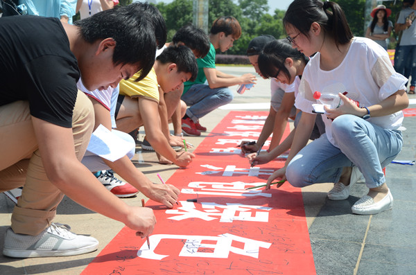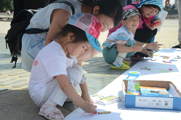 活动现场设置了一张长幅画纸和各式画笔,供来往市民画出有关环境的画作,吸引了许多年纪较小的孩子。倪大爷带着他的孙子路过,指导孩子画着绿树蓝天,他对活动给了很高的评价,他说:“大学生能有这种环保意识很好,家长平时也要教育孩子节约资源。”大三的余勇已经是第三年参与环境日的宣传活动了,他表示只要他在学校,都会来帮忙宣传。