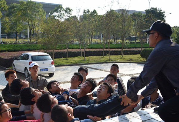 随后,在培训员的带领下,队员们来到稼先楼前,借助楼前的高台完成最后一项活动——信任背摔。该活动要求每位队员轮流站在台上,背对着大家,团队其他队员在其身后用双手搭建保护网,接住倒下的队员。培训员道出了其中的意义:“只有相信你的队友们,才能毫不犹豫地摔倒,而不保护自己。短时间内建立起来的队伍,彼此之间的信任度怎么样,值得考验。”