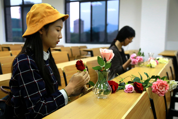 志愿者们为老人举办了一场文艺演出。深情婉转的《当你老了》歌曲演唱,神情并茂的黄梅戏表演,还有暖人心的手语表演《爱》,老人们看得津津有味,尤其是小品表演,逗得老人们笑个不停。表演过程中,志愿者们还现场折纸花送给老人。在外国语学院举办的重阳插花活动中获奖的作品,也被摆在了老人们的房间。