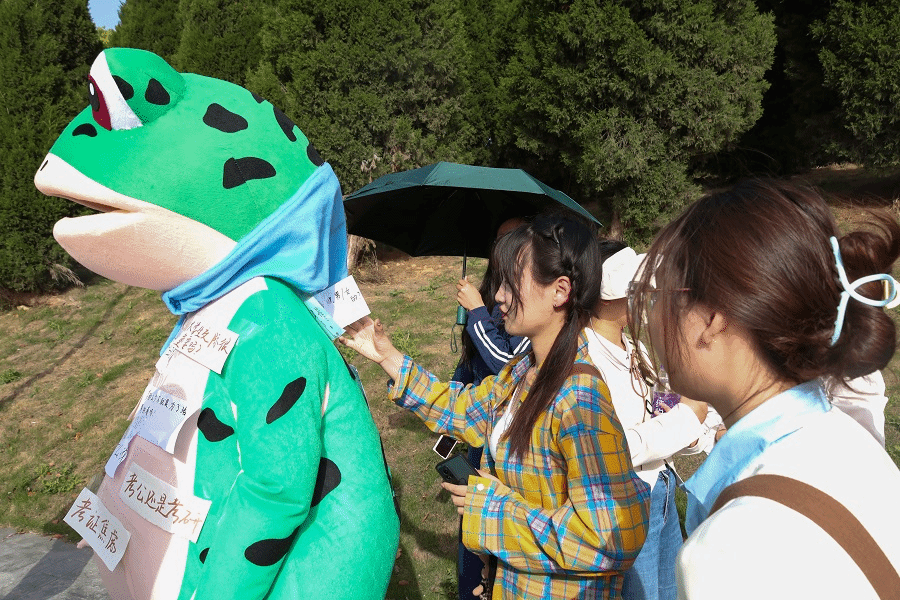 虽然天气炎热,人偶服厚重,但是扮演青蛙的同学依然乐在其中。“大家撕掉标签后,仿佛我自己的压力也被撕掉带走了。”工商管理类专业2022(2)班黄陈宇表示,穿上可爱的青蛙人偶服,摆脱了他的原有身份,在给大家带来乐趣的同时,他也得到了这份欢乐,收获了满满的成就感。