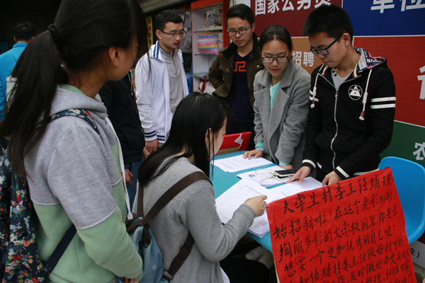 “请问大学生村委会主任助理具体要做什么工作?”“对招新有什么要求吗?” 不少同学对“村官”存在诸多疑惑。4月7日,大学生村委主任助理将招新点设在了三大食堂,吸引很多前来询问、报名的学生。