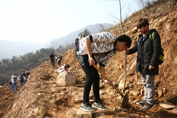 “之前我们与安庆市林业局已经协商,他们给我们安排在这里植树,所以我们每个同学都很珍惜这次植绿的机会。”资源环境学院实践拓展部部长孙维昌说。3月12日上午来到义务植树区后,看着漫山等待植绿的黄土,同学们都握紧了手中的铁锹,拿起路边早已准备好的树苗,走向山地。