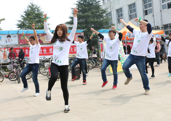 10个人身穿着绿源会服,音乐一响,马上从人群中走出来,随着节奏舞动着,一场别出心裁的“快闪”舞蹈在食堂门口上演着。周六的安苑食堂出口处,因此显得特别的热闹。除了快闪外,绿源还张贴了一份环保号集令,过往的同学们都会在“号集令”上按上一个手印,用承诺表达自己的环保态度。有的同学也会在“号集令”上写上自己的环保祝福语,来表达自己的环保思想。“让地球母亲休息一小时吧,保护环境,从你我做起。”听完“地球一小时”活动介绍的赵越在卡片上写道。