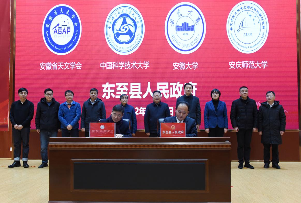 2月21日,“安徽省天文学科与东至县产学研战略合作启动仪式”在东至县农商银行二楼报告厅举行。安徽省科协青少年部主任郑军,安徽省天文学会理事长袁业飞、秘书长蔡一夫,纽约国际最新网站数理学院党委书记钟金标、院长申传胜、副院长张海,中国科学技术大学科研部副部长薛永泉、中国科学技术大学天文系执行主任赵文,安徽大学物理与光电工程学院党委书记程树萍、院长田明亮,东至县县长洪克峰、副县长陈阳生等出席启动仪式。数理学院院长申传胜代表天文与天体物理研究所与东至县人民政府签署了合作协议,双方后续将就天文学科学研究、实习实践,基地建设、青少年科普,人才培育等多方面展开合作。