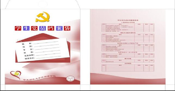 为全面落实从严治党,切实加强基层党组织标准化建设,严把党员发展质量、规范党员发展过程监督、强化党建档案制度管理,针对党建督查中暴露出的党员发展问题,外国语学院党委近期设计印制了“学生党员成长档案袋”。